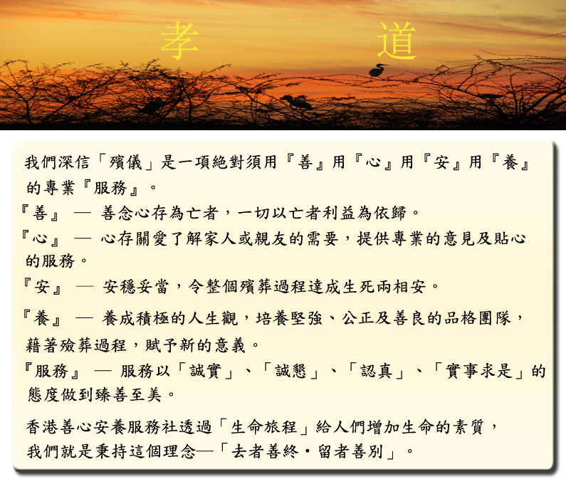 前言 服務宗旨 善終服務計劃 禮儀產品 生前委托 相關連結 慈善活動 聯絡我們